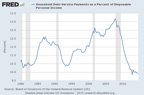 7. American households have the lowest debt burden in more than three decades. And the largest portion of household debt is mortgages, most of which are fixed-rate. So when people ask, "What's going to happen to debt burdens when interest rates rise?", the answer is "Probably not that much."