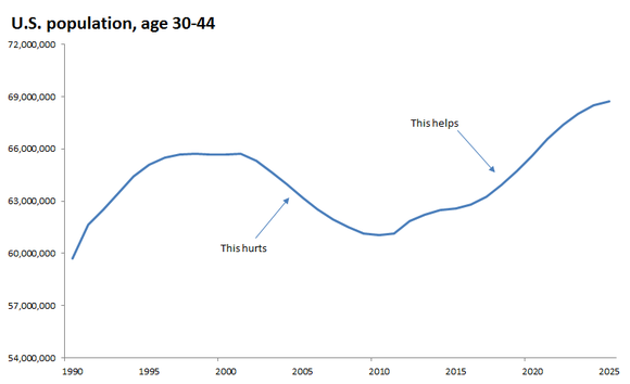 1. The U.S. population age 30-44 declined by 3.8 million from 2002 to 2012. That cohort is now growing again. By 2023 there will be an estimated 5.8 million more Americans aged 30 to 44 than there are now, according to the Census Bureau. This is important, because this age group spends tons of money, buys lots of homes and cars, and start lots of new businesses.