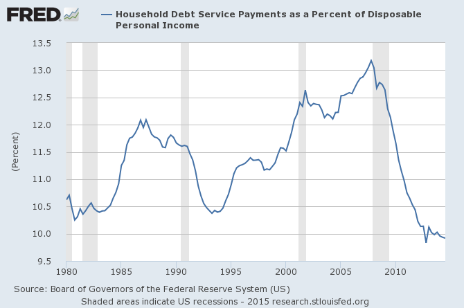 7. American households have the lowest debt burden in more than three decades. And the largest portion of household debt is mortgages, most of which are fixed-rate. So when people ask, "What's going to happen to debt burdens when interest rates rise?", the answer is "Probably not that much."