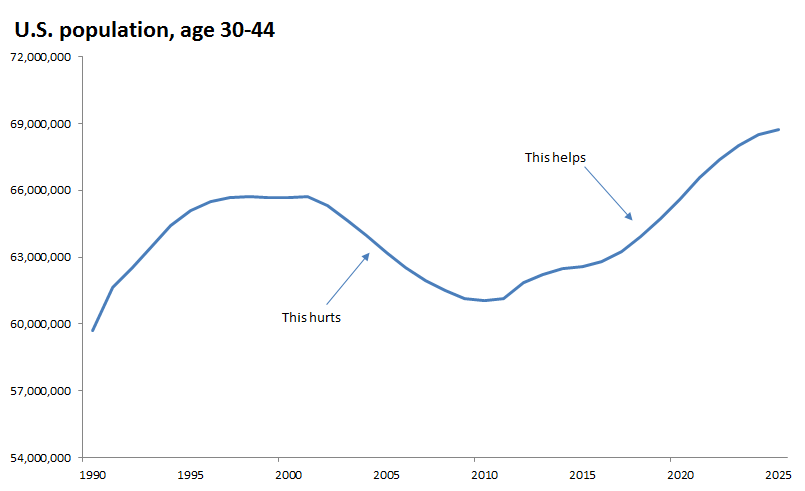 1. The U.S. population age 30-44 declined by 3.8 million from 2002 to 2012. That cohort is now growing again. By 2023 there will be an estimated 5.8 million more Americans aged 30 to 44 than there are now, according to the Census Bureau. This is important, because this age group spends tons of money, buys lots of homes and cars, and start lots of new businesses.