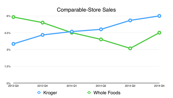 Lower prices and better selection translate into market share gains for Kroger. Mainly that has meant stealing customers from Wal-Mart. But Kroger is increasingly pushing into Whole Foods' territory. The grocer has outgrown the organic food leader for the last four quarters running.