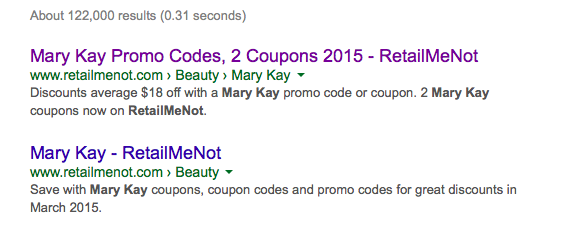 But if nothing else, RetailMeNot's promotion is at least driving traffic to Mary Kay's site, which you'd think the cosmetics giant would be happy about. It would likely generate some sales and may even hook up a customer with a local beauty consultant.