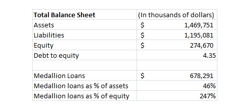 Thus, even small loan losses on its medallion portfolios could have a significant impact on Medallion Financial's income and equity. A mere 10% writedown on its medallion loan books would erase nearly 25% of Medallion Financial's equity. At 20%, nearly half of its equity would be eliminated.