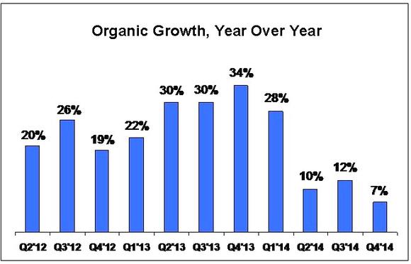 In 2014, 3D Systems' organic revenue growth (revenue growth in businesses owned for at least one year) slowed considerably. It seems probable that at least some of this slackening was the result of the previously mentioned downside of a supercharged growth-by-acquisition strategy.