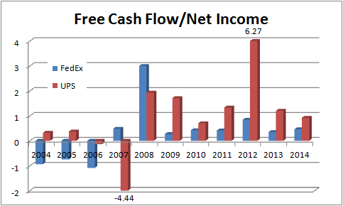 UPS tends to trade at a premium (based on earnings multiples) to FedEx because the former has done a much better job of translating its earnings into FCF in recent years: