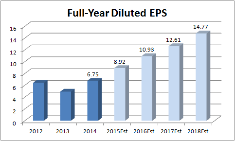 First, the results of the profitability improvement plan are evident in the analyst consensus for future earnings. Note the sharp increase in growth from 2014 to 2016. It stands to reason that if FedEx can increase its earnings dramatically, then its FCF generation should increase strongly, too -- even without any pickup in conversion rates.