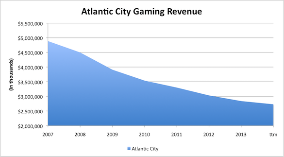 I can't see why any company in its right mind would invest a dollar in Atlantic City today, much less $126 million. The city's gaming revenue has dropped 44% since 2007, and everything from room revenue to entertainment is struggling. Despite an economic recovery nationwide, there's no sign that Atlantic City will ever recover, especially when you look at expanded gaming in Pennsylvania, Connecticut, New York, and Massachusetts.