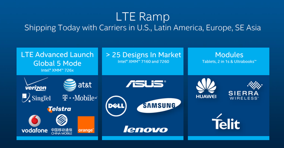 This modem supports LTE-Advanced category 6 speeds (300 megabits per second download/50 megabits per second upload), which is quite competitive today. Further, according to Intel's analyst day presentation, the XMM 726x generation of modems is qualified on a whole host of carriers: