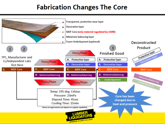 "Deconstructive testing" changes the very nature of the flooring, providing for wide variations in results. Image: Lumber Liquidators Business Update presentation, March 12, 2015.