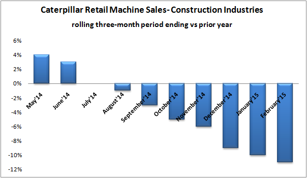 That's not the kind of picture you'd want to see. Caterpillar's construction-equipment sales are clearly trending downward. Aside from weak international markets, such as Europe and Latin America, the North American market is also showing signs of stress. For example, Caterpillar's construction machine sales from North America for the three months ended this past February fell 1% year over year compared to 8% growth registered for three-months ended November 2014.