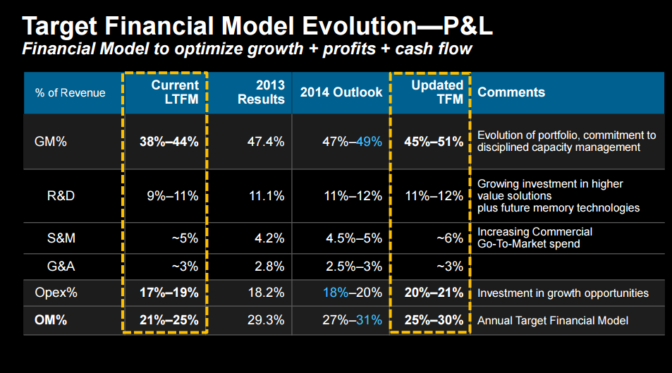 Management, however, was optimistic at the time that business would pick up in the second half of 2015, with CFO Judy Bruner saying the company would be in the "upper half" of its target financial model during that period (you can see this model in the slide below):