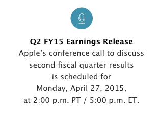 Apple's second-quarter results as well as the link to the conference call will be available here about 15 to 30 minutes after market close on April 27. The conference call will begin at 5:00 p.m. ET.