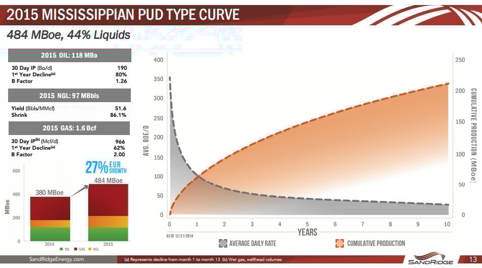 The other thing I want to point out that is driving SandRidge's natural gas growth in 2015 comes from the first-year decline rate of its wells. The slide above notes that the wells it plans to drill this year have a first-year decline rate of 80% for oil and 62% for natural gas. Those decline rates are pretty typical for wells the company drills in its core region from prior years.