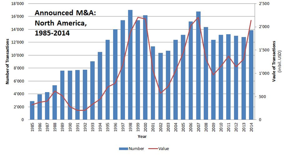 Mergers and acquisitions occur for all sorts of company-specific reasons, but they are also heavily determined by economic and financial conditions. For example, older readers will remember how the emergence of junk bonds in the 1980s led to a boom in M&A activity as companies pursued leveraged buyouts. A slowdown in the economy and the collapse of the junk bond market led to a temporary moderation in deal activity, before a strong pickup in the 1990s.