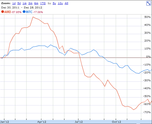 Intel, which derives most of its revenue and profits from PC chip sales, experienced a very similar trend in its share price during 2012. Now, the decline wasn't as steep (AMD is a far more volatile stock, and that volatility cuts both ways) but the directions were roughly the same.