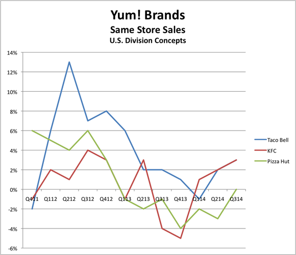 For instance, the Yum! Brands Mexican fast-food chain Taco Bell has only had one quarter of negative comparable sales in the past three years while the KFC chicken outfit had just three such quarters. But Pizza Hut has only had four quarters of growth in that time frame and not a single one since the fourth quarter of 2012.
