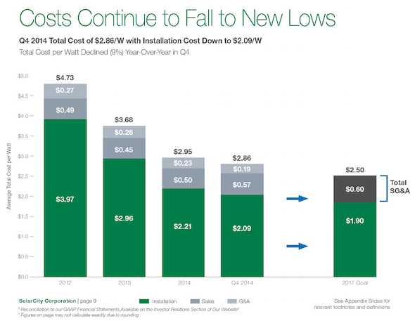 Over the past few years, one of the most remarkable things about SolarCity (SCTY +0.00%) and Vivint Solar (VSLR +0.00%) has been their ability to cut costs. In the case of SolarCity, the cost to install a watt of solar panels has fallen from $4.73 in 2010 to $2.86 in the fourth quarter. A lot of that savings came from lower solar panel prices.