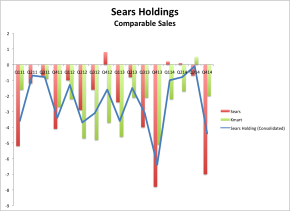 Comparable store sales fell 2% at the Kmart division and plunged 7% at Sears' namesake stores last quarter. Overall revenue dropped 15% in the quarter. While that was due in large part to spinning off the Lands' End division and store closures, it points to the problem Sears faces as it has fewer and fewer options to generate sales.