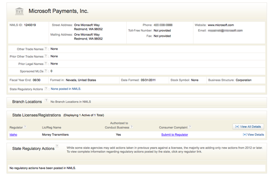 1. Microsoft's mobile payment platform might be called "Microsoft Payments." Banking consultant Faisal Khan recently tracked down some information on Microsoft's possible system and found the official money transfer license filing for "Microsoft Payments," I've included my own screenshot below from the Nationwide Mortgage Licensing System & Registry, also known as the Nationwide Multistate Licensing System. (Yes, the NMLS literally has two names. It should really do something about that.)
