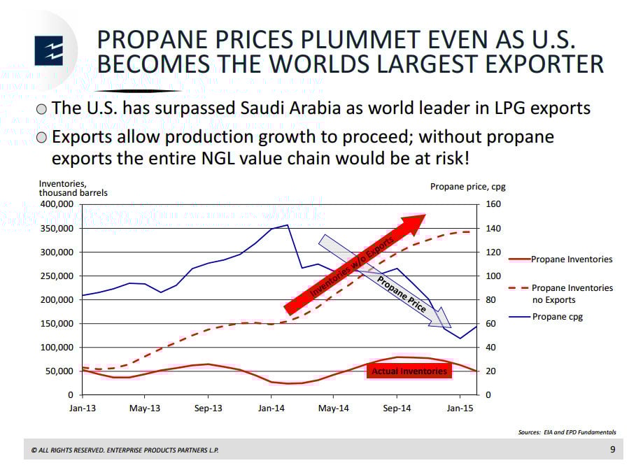 As that chart points out the U.S. has become the world's propane export king due to strong production growth and increased export capacity. That export capacity will continue to increase as Enterprise Products Partners is already in the process of more than doubling its leading export capacity. By the end of this year its capacity will have grown from 7.5 million barrels per month to 16 million barrels per month. Meanwhile, Targa Resources Partners has the second largest LPG export presence on the Gulf Coast, which can be further expanded in the future. While neither is a pure play on propane exports these are the two leading propane exporters in the country and offer investors the most upside to this growing market.