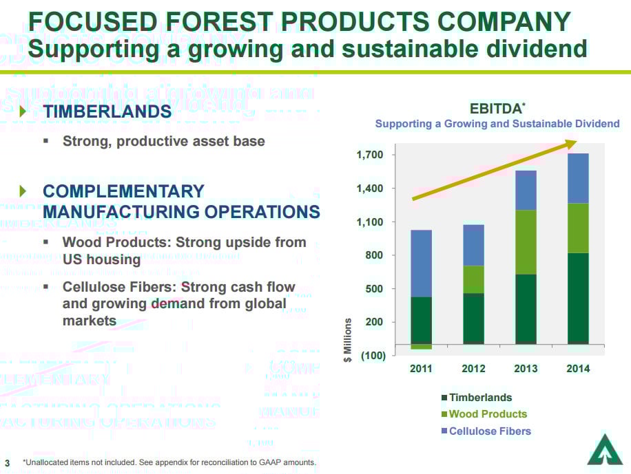 Rayonier is the smallest of the three; it manages just 2.7 million acres. It's more of a pure play on timberlands than the other two, as it recently spun out its own cellulose fibers business into Rayonier Advanced Materials (RYAM +0.00%). Post-spin, all but 38% of Rayonier's income in 2015 is expected to come from managing its timberlands for lumber, but that still adds up to a lot of cash that the company returns to investors via a robust 3.75% dividend.