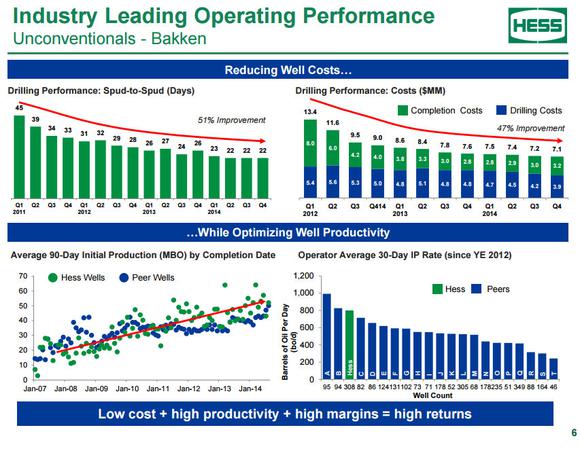As we can see on that slide, the company has enjoyed remarkable improvements in its drilling operations. Hess is drilling wells almost twice as fast now, as its spud-to-spud days, which are the days between starting and completing a well by a rig, are down 51% since 2011. This is leading to dramatically reduced well costs, which are down 47% since 2012. Best of all, the company isn't just drilling wells cheaper and quicker, but it's drilling better-quality wells, as Hess' production rates are at the high end of its peer average. This is leading to better returns, even at the currently weak oil price.
