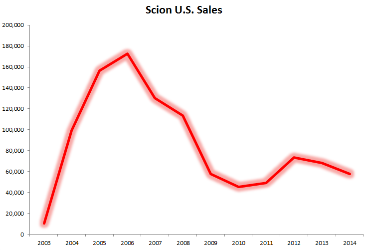 Toyota, which is often known for high-quality but boring vehicles, wanted to shake things up when it created its Scion brand. The idea was to appeal to a younger, more performance- and sport-oriented consumer. It appeared to have the right idea at first, as you can see the spike in sales below, but then the brand lost its magic as two of the brand's best-sellers, the tC and xB -- which generated roughly 85% of total Scion sales in 2006 in the U.S. -- posted respective sales declines of 77% and 73%, respectively, from 2006 to 2014.