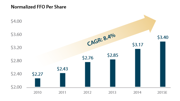 The company's business model seems to be working. Rent is rising faster in Equity's markets than in the overall United States (6.2% versus 4.6% in 2014), and the company has been able to increase its funds from operations, or FFO -- how REITs generally measure their income -- by more than 8% per year on average since 2010.