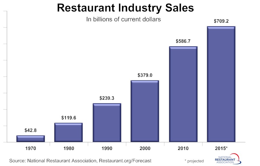 While the recession hurt the restaurant industry, Americans still love eating out, and sales in 2015 are expected to top $700 billion, up from $586 billion in 2010, according to the National Restaurant Association.