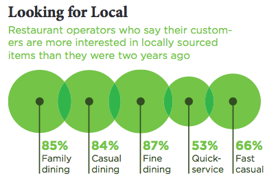 For both sit-down and limited service restaurants (which include what non-industry folks think of as "fast food" and "fast casual"), chefs clearly indicate a push toward locally sourced ingredients. For restaurants which offer service from waiters, a 2015 NRA survey of chefs ranked "locally sourced meats and seafood" as the top menu trend with "locally grown produce" placing second. For limited service restaurants, locally sourced was the No. 3 trend behind only gluten-free products and sustainable food items.