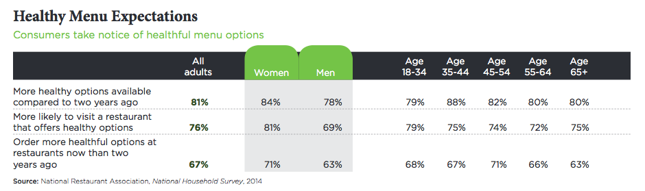 Almost as important to diners as locally sourced food are restaurants having healthy choices to pick from. Over three out of every four households surveyed by the NRA said they were more likely to eat at a restaurant if it offered healthy options. In addition, nearly seven out of 10 people surveyed said they were more likely than they were two years ago to choose meal items that are better for them.