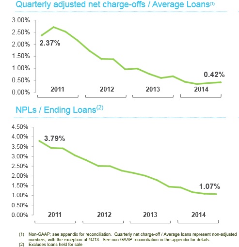 Since the financial crisis, the bank has done a good job of building up its capital levels and improving credit quality. All credit metrics continued to improve in 2014, and at the end of the year, Regions' nonperforming loans made up just over 1% of the entire portfolio, down significantly from nearly 3.8% in 2011.