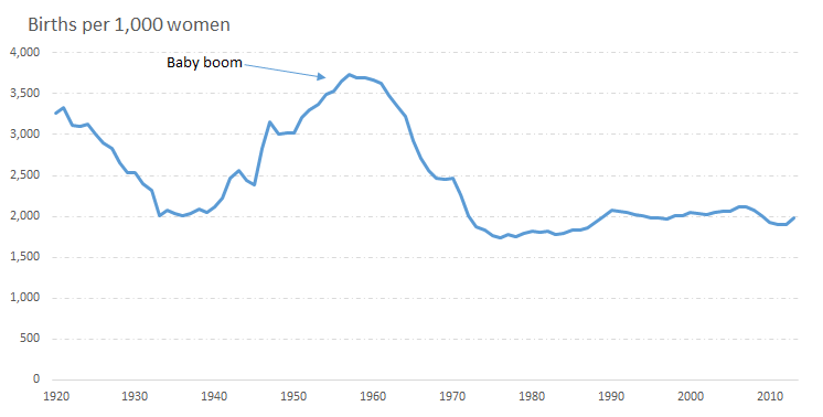 Probably because there was no boom after World War I, which was the best comparison for what to expect after World War II. In fact, fertility fell after the end of the first war from 3.3 children per woman in 1917 to an average of 2.9 in the 1920s.