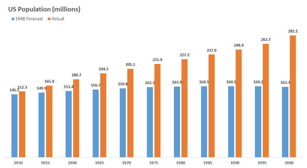 What's more, the report's projection of total U.S. population wasn't just a little off; it was disastrously, off-the-charts wrong. The baseline 1948 forecast predicted 163 million people would live in America by the year 2000. In reality, it was 282 million. That difference -- 119 million people -- is the equivalent of missing three Californias, or 14 New York Cities.