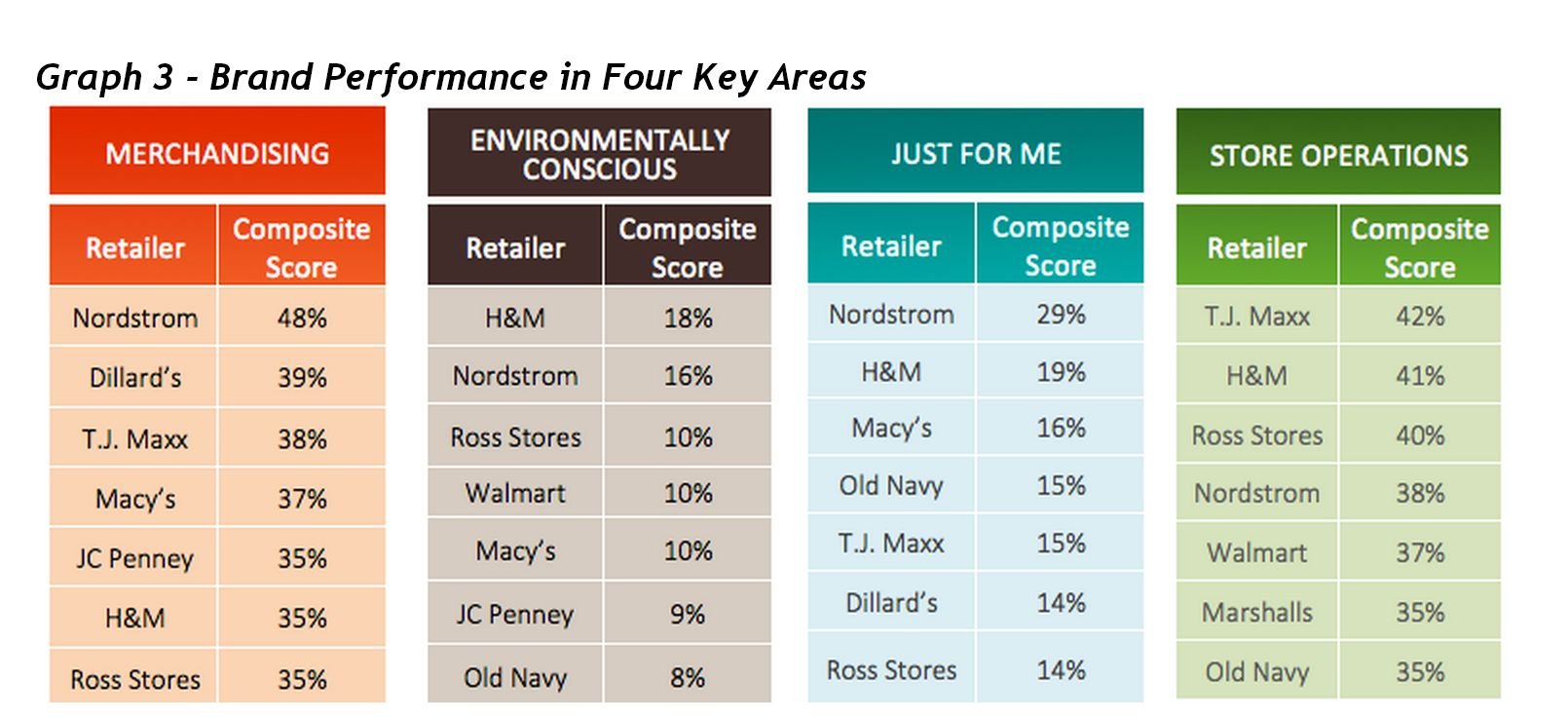 Nordstrom comes in second place behind H&M in environmental consciousness, so the company is still doing quite well on that front. There seems to be some room for improvement in store operations, though. This could be related to variables such as speed of checkout. Nordstrom is renowned for the politeness of its employees, its personalized service, and comfortable atmosphere. It's hard to be both attentive and quick at the same time, so maybe Nordstrom's strength in service quality means a weakness in speed to some degree.