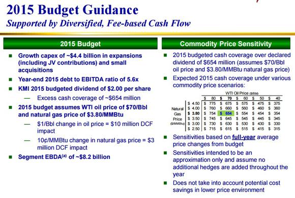 However, as this slide makes clear, even if natural gas prices were to fall to below $2.50 per thousand cubic feet and oil below $40 per barrel for all of 2015, Kinder would still be able to support its $2-per-share 2015 dividend.