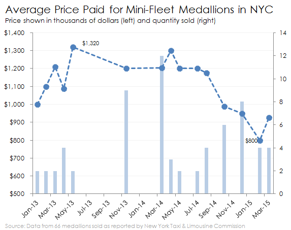 He's not wrong to worry. The foreclosure and sudden sale of 87 of his mini-fleet medallions would make up a substantial portion of the market. By my count, only 66 mini-fleet medallions traded hands from January 2013 to March 2015 in arm's-length transactions.