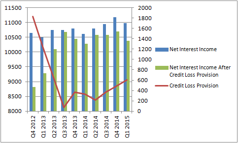 Investors should also look for how increasing credit loss provisions are reducing profitability. As the following chart makes clear, Wells Fargo's credit loss provisions (red line) are rising again after a substantive fall to the third quarter of 2013. This helps you understand why net interest income after credit loss provision (green bar) is growing slower than net interest income (blue bar).