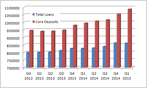 As the following chart shows, Wells Fargo has had little problem receiving deposits from customers, but its total loan book hasn't grown in proportion. In fact, the amount of loans at quarter-end actually fell sequentially in the first quarter.
