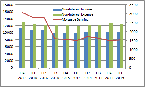 Probably the most positive aspect to the results was that mortgage banking income (red line) rose year over year after a few quarters of declines. It contributed $37 million to the overall total noninterest income (blue line) rise of $182 million, but proved a minimal offset to the $559 million increase in noninterest expense (green line). Essentially, low interest rates have spurred extra mortgage activity, but how much longer can this last?