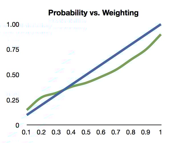 If we're thinking "purely" rationally, we should give an equal weight to each probability -- a 5% chance should be considered a 5% chance, and a 95% chance should be considered a 95% chance. In reality, we tend to overweight the low probabilities, meaning in our heads they are more important or of greater value than they actually are, and we underweight high probabilities.