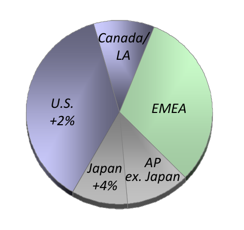From a geographic point of view, adjusted sales increased 2% year over year in the Americas but declined by 2% in the rest of the world. A strong turn of services and hardware sales in Japan was obscured by weakness in the rest of the Asia Pacific market.