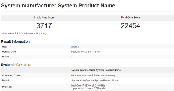 Notice how the multicore score shows roughly 4.1x scaling over the single-core score? Well, here's a Geekbench 3 result I obtained using an Intel Core i7-4930K: