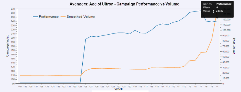 But even that may be conservative. Social buzz for the various Age of Ultron trailers is more than twice that of any other film in the genre measured over the course of Networked Insights' two-year study: