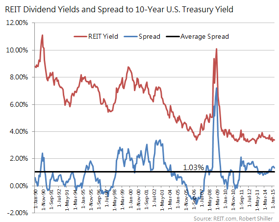 And if we compare current dividend yields -- dividends are a good proxy for earnings, since REITs pay out virtually all of their earnings as dividends -- we can see that the current spread of 1.33% is well above its historical average.