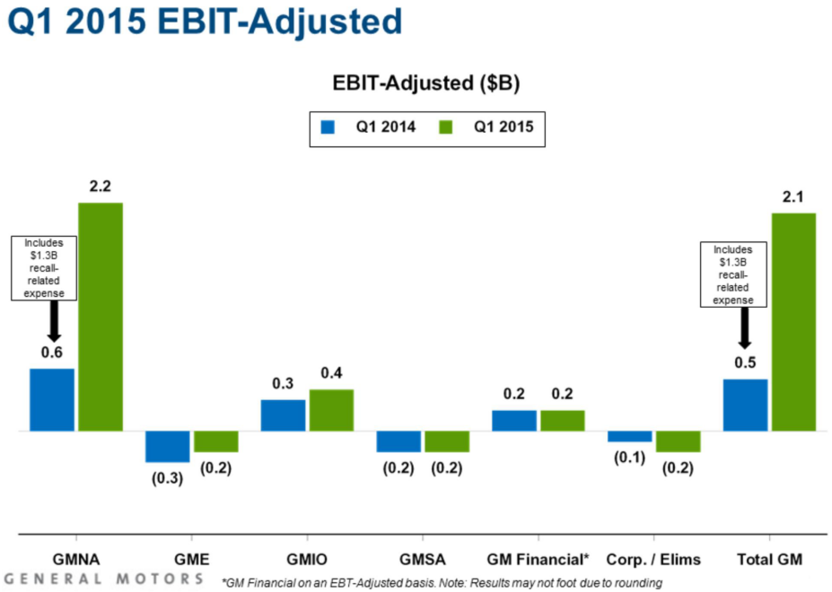 It won't take you long looking at the graph above to see the bright spot is clearly GM North America, or GMNA, which of course is typical. Still, GMNA checked in with an EBIT-adjusted for the record books, and it was the best first-quarter performance GM has generated since emerging from bankruptcy in 2009.