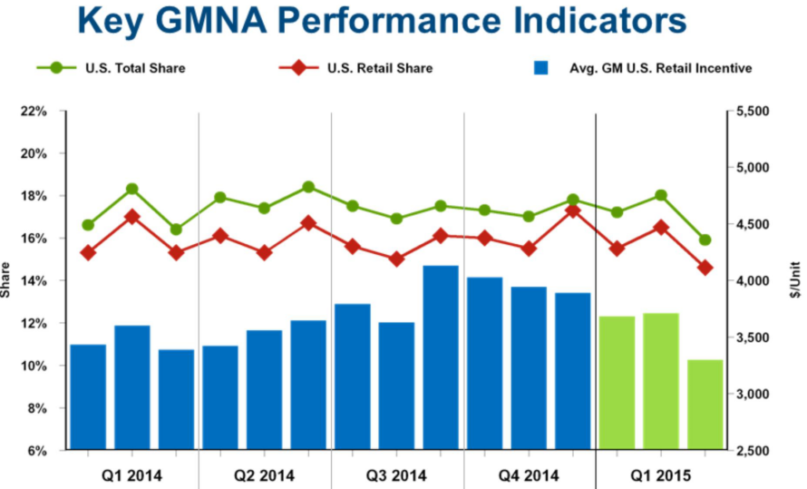 As you can see, incentives have consistently declined for nearly two years. Also, average transaction prices increased roughly $1,900 per unit compared to last year's first quarter. When incentives lower and ATPs rise, it's a much more profitable scenario. Now, it's true GM's market share took a dip, despite each sale being more valuable, but that's expected ahead of important and/or high-volume launches, such as the upcoming Malibu, Cruze, and CT6.