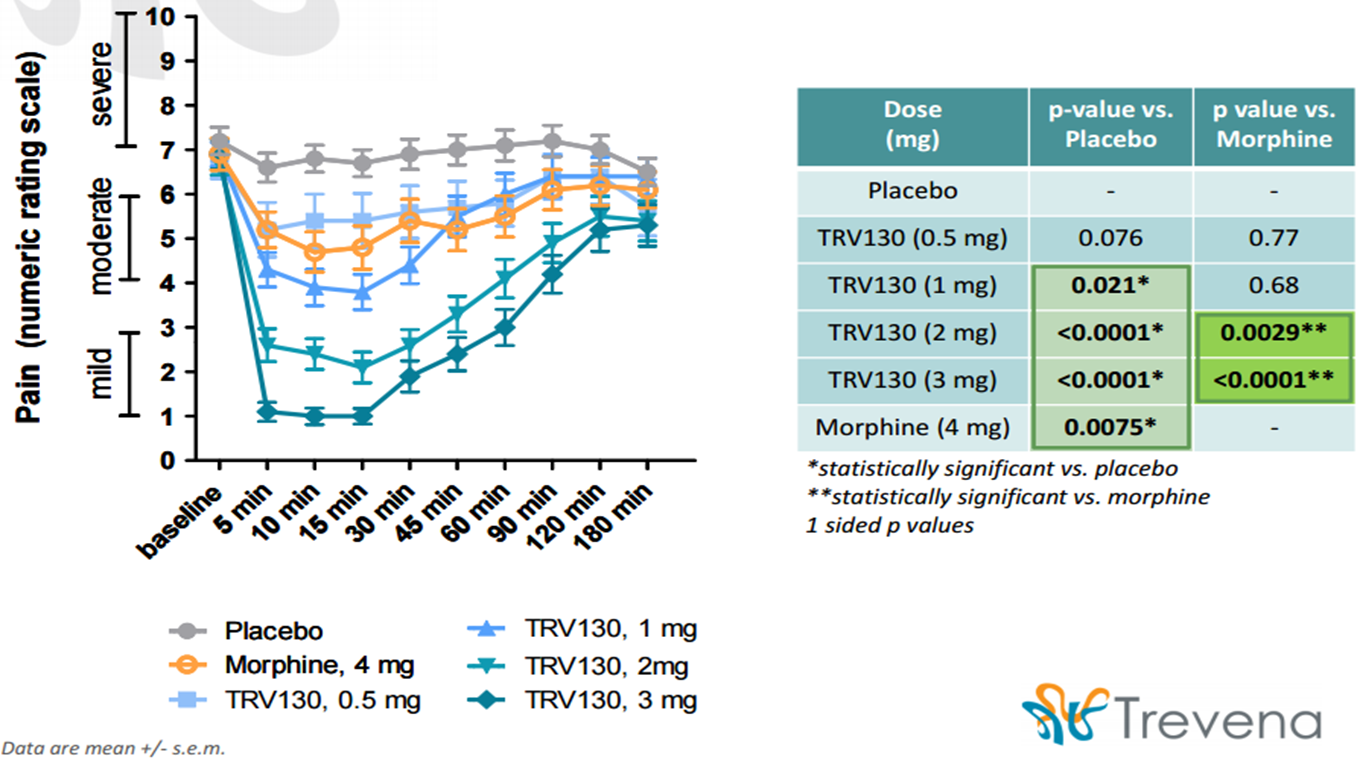 In a mid-stage trial comparing four different doses of TRV-130 against placebo and morphine, the 2 and 3 mg doses of the experimental drug significantly improved pain control, compared to patients receiving either a placebo or morphine, and this result persisted for about two hours: