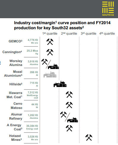 For example, size is relative. South32 will be small in comparison to BHP, but it won't be small on an absolute basis -- these businesses earned $8.3 billion worth of revenue in fiscal 2014. And roughly 85% of South32's EBITDA is expected to come from assets that rank in the top two quartiles for cost in their industries. Some of these assets are leaders in their respective spaces, too. For example, Worsley Alumina is one of the largest alumina refineries and is in the top quartile of its industry for costs. South32 will have similarly situated businesses in manganese and silver, too.