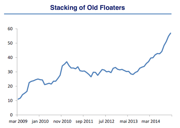 According to Seadrill's recent presentation at the Howard Weil Energy Conference, 34 floater rigs were stacked in 2014, and a total of 54 floaters are stacked. Another 70 rigs will come off contract in the next 12 months that could be stacked or scrapped.